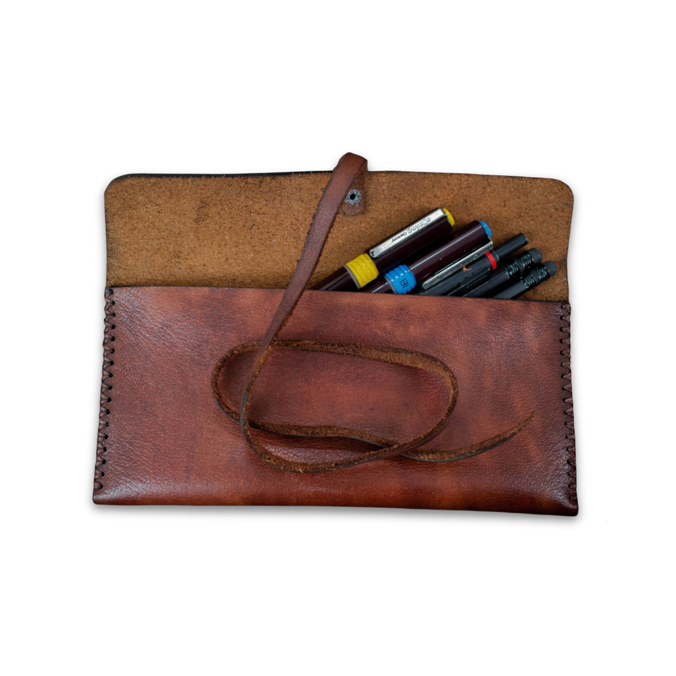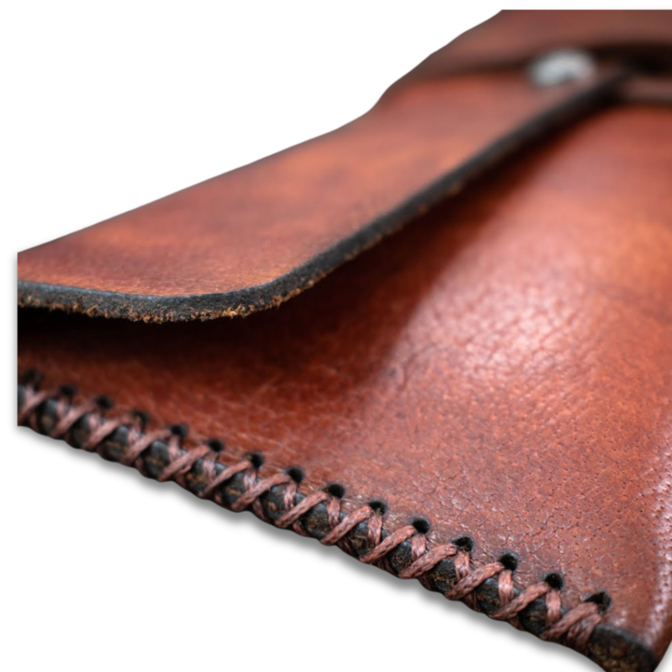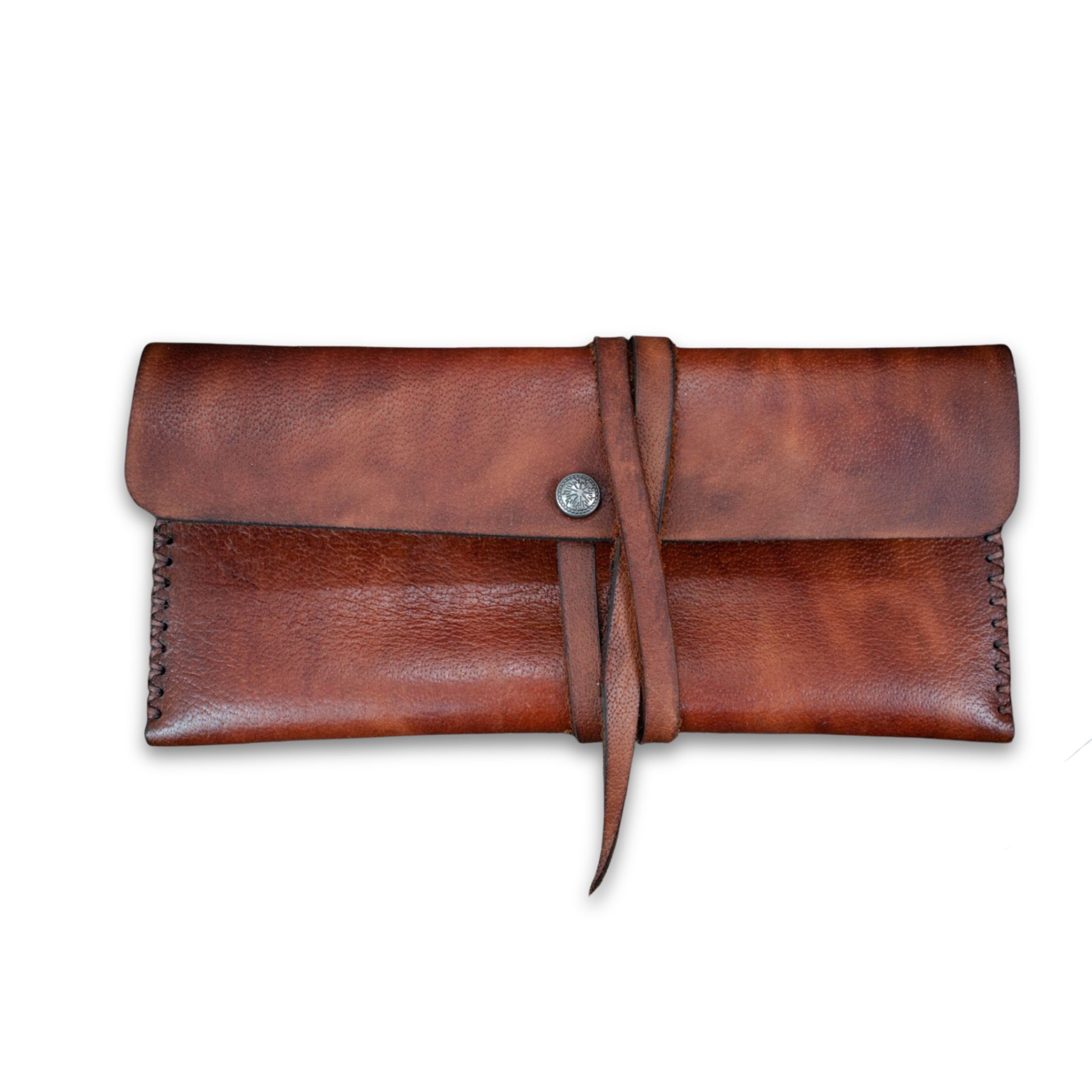 Είναι φτιαγμένη από αυθεντικό δέρμα veg tanned υψηλής ποιότητας εξ ολοκλήρου στο χέρι. Με ιδιαίτερη ραφή στο πλάι και ένα μοναδικό διακοσμητικό κόντσο στο κέντρο. Κλείνει με κορδόνι που τυλίγεται γύρω από τη θήκη δίνοντάς της ένα western στιλ.
