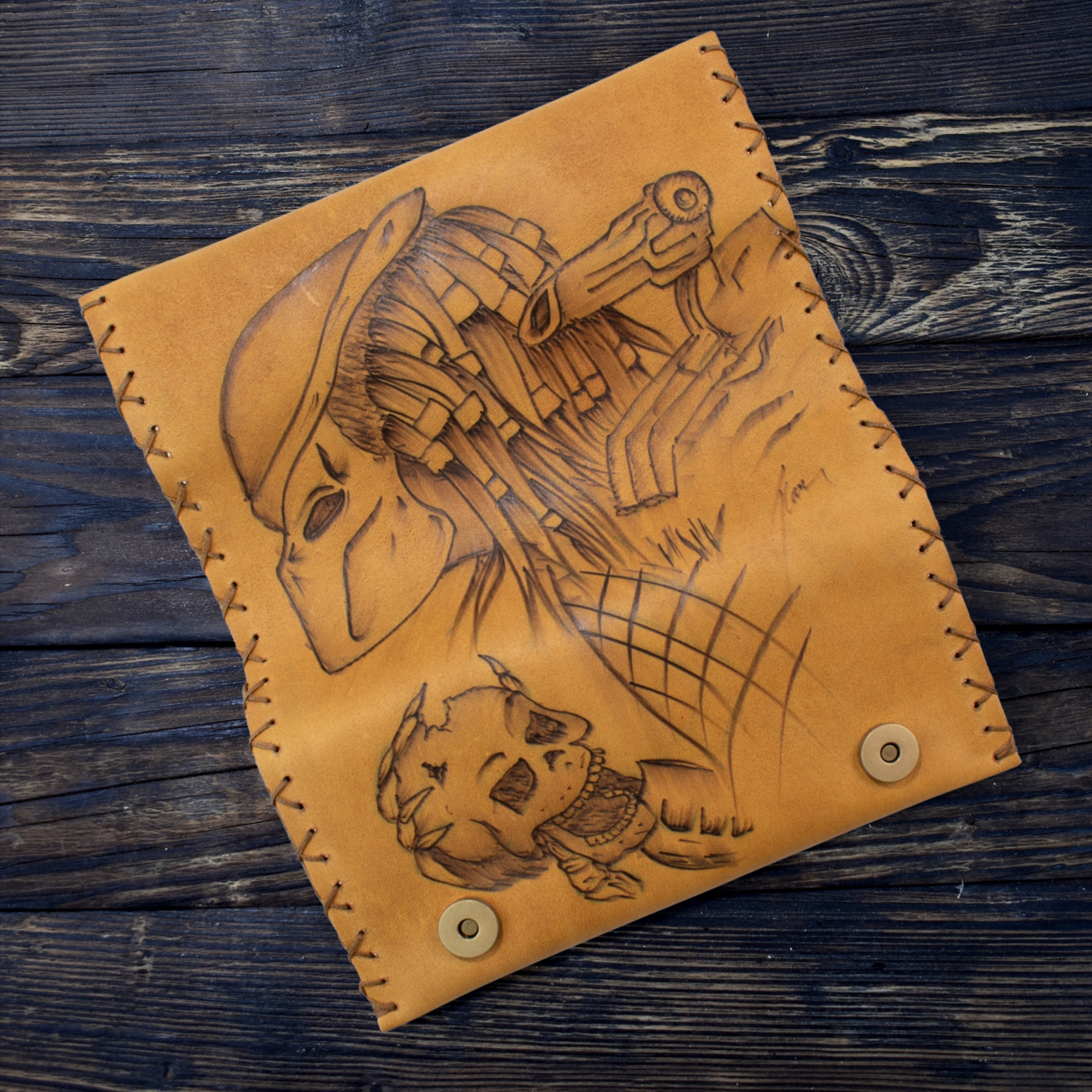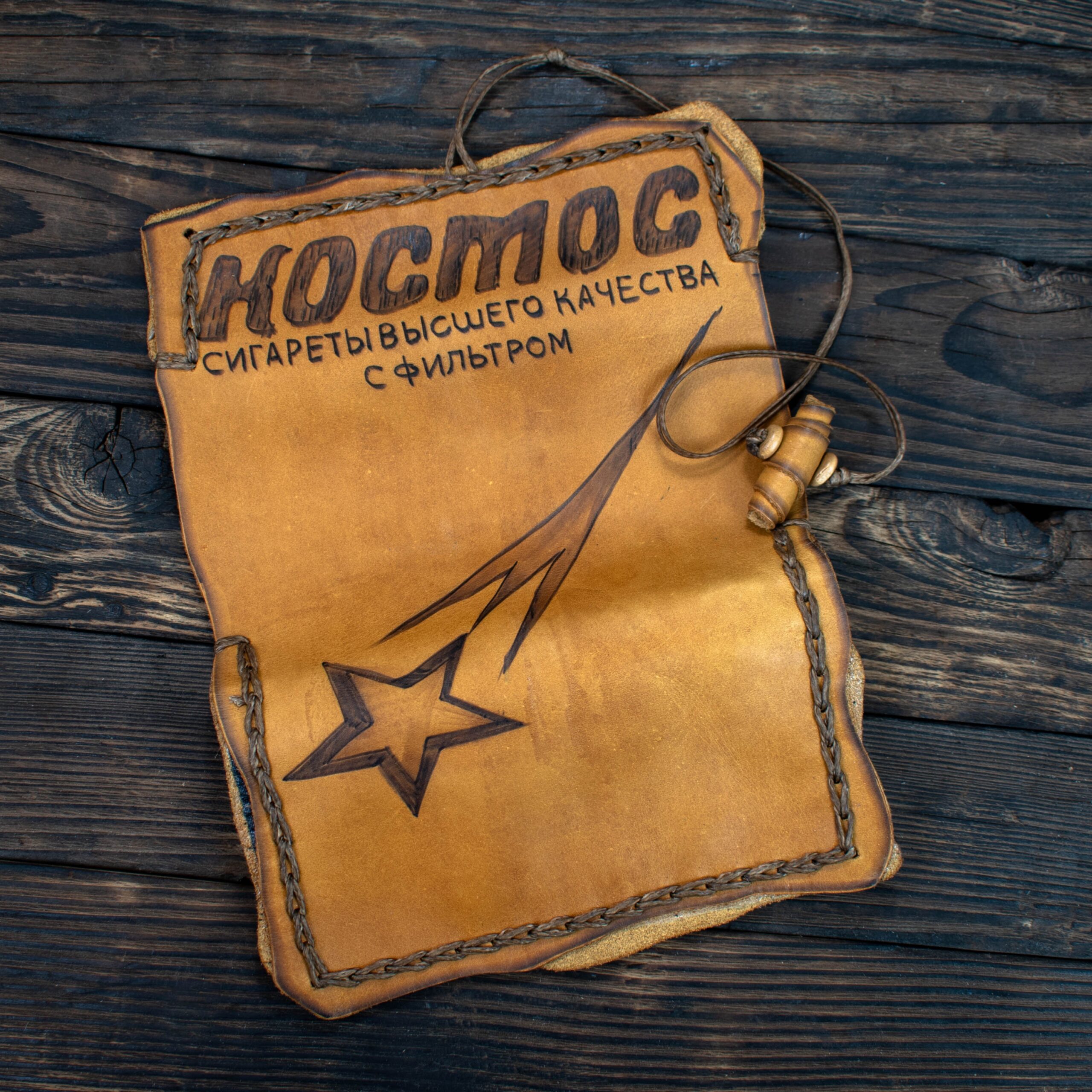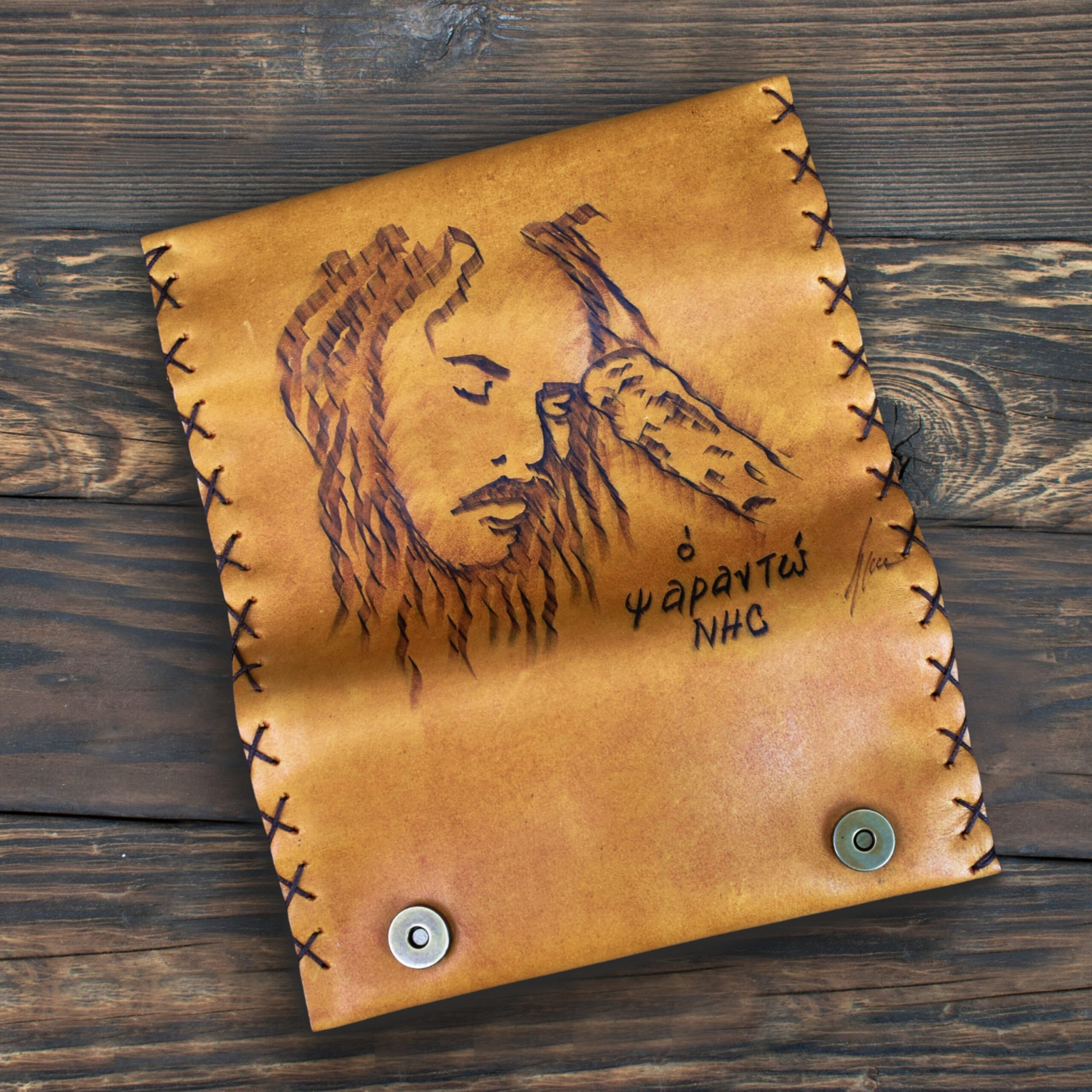 Από χοντρό φυσικό δέρμα διακοσμημένη στο χέρι με τη μέθοδο της πυρογραφίας για να αποθηκεύετε και να μεταφέρετε με στυλ τον καπνό σας.
