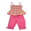Τζην σορτσάκι από σταθερό βαμβακερό ύφασμα με λάστιχο στη μέση, τσεπούλες και φιογκάκια, συνδυασμένο με πουά ριχτό αμάνικο μπλουζάκι. 100% βαμβακερό.